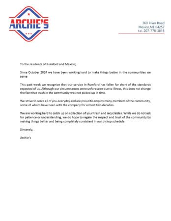 Please see the below letter from Archie’s regarding issues with trash pickup last week.