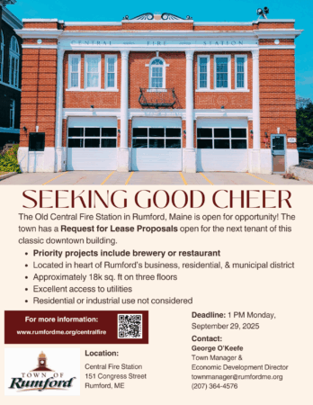 Notice & Intent: The Town of Rumford is seeking proposals from commercial developers and entrepreneurs for negotiation of terms for a lease with the Town of Rumford at the Old Central Fire Station at 151 Congress Street in Rumford. Proposals for restaurants, microbreweries, or other similar operations are the preferred option. Proposals for non-profit use of any kind are the least preferred option. Proposals involving residential or industrial reuse of any kind will not be considered. The Board of Selectpersons will make a subjective decision taking into consideration, experience, qualifications, along with any other tangible and intangible aspects of the lease proposal they, in their sole authority, deem relevant.